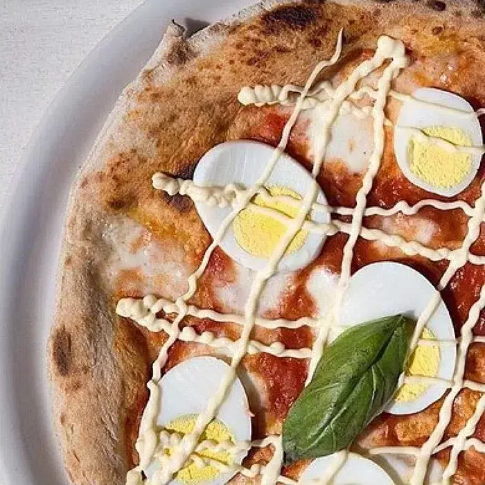 In effetti una pizza margherita farcita con uova tagliate a fettine e maionese, d’istinto non ispira la maggior parte di quanti sono abituati ai gusti classici delle pizze, ma chi ha occasione di assaggiarla è solito tesserne le lodi.